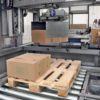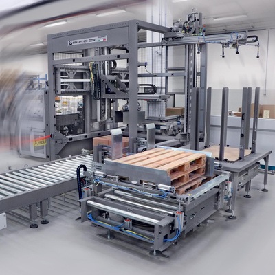 A série APS 1550 ERGON é composta por sistemas automáticos de paletização de caixas, pacotes, bandejas e outras embalagens de uso comum para produções de até 50 pacotes / minuto. Graças à tecnologia SCARA implementada na coluna central, os sistemas de paletização propostos pela Smipal são extremamente flexíveis e facilmente adaptáveis a qualquer condição logística da área de final de linha do usuário, tanto em plantas existentes quanto em novas operações.