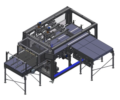 Alimentação de entrada única com sistema de formação de camada a 90° equipado com: 1 esteira de sincronizadora emborrachada, 1 esteira de alimentação de produto, para formar a linha e 1 sistema de translação unidirecional que contribui para formar a camada na cesta. O sistema de formação de camada é equipado com motores de baixo consumo de energia. Projetado de acordo com as metodologias FCR (Redução de custo total), é testado e fornecido ao cliente totalmente montado e cabeado. O tempo de inicialização é muito curto, pois consiste em conectar o cabo de sinais e potência do sercos fieldbus ao módulo central do sistema de paletização APS. A estrutura ergonômica e funcional da estrutura permite que o operador realize facilmente todas as operações relacionadas ao uso e manutenção da planta.