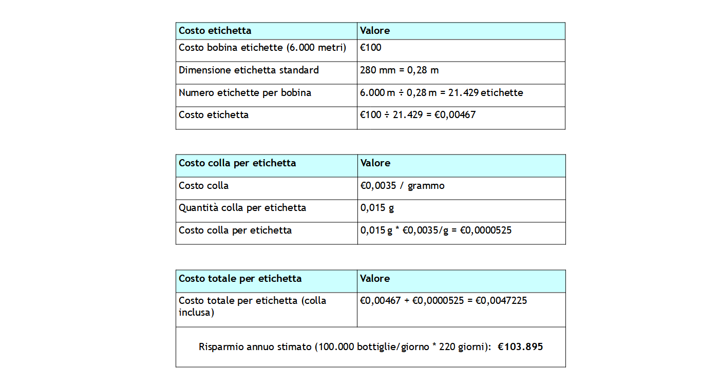 A seguir, um exemplo concreto, baseado nos custos médios do mercado italiano e em uma capacidade produtiva de 10.000 garrafas por hora.